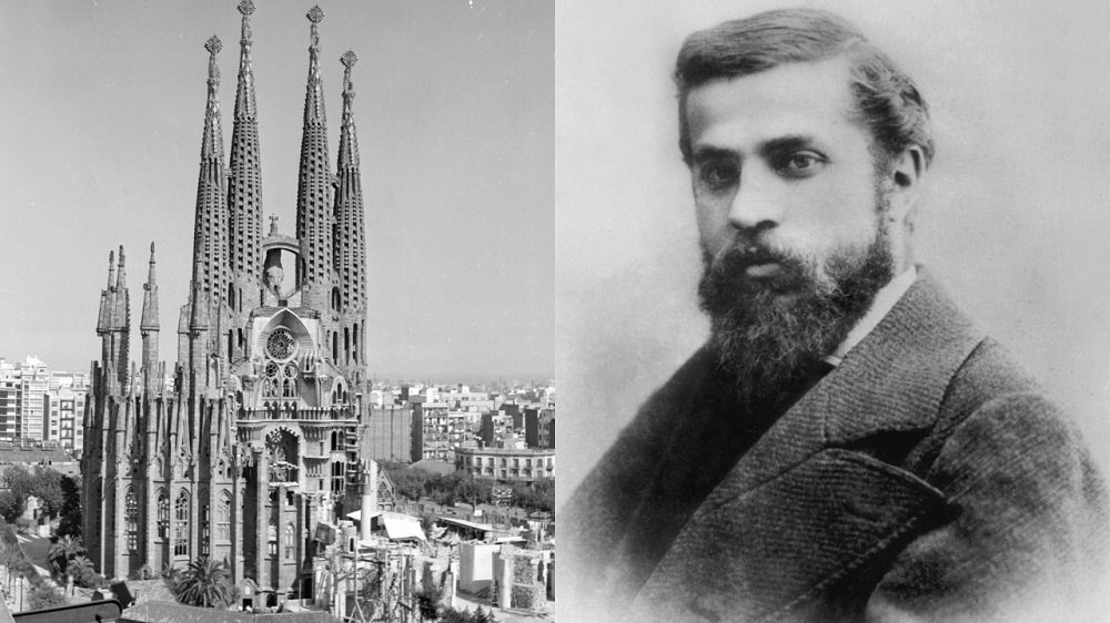 Sagrada Família em Barcelona em 1930 e fotografia de Gaudí (Foto: Getty Images)