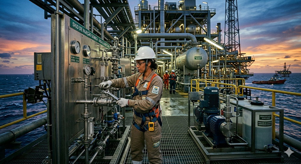 Neste contexto, a atuação do profissional da Química é essencial para a segurança e eficiência de todo o processo. De acordo com o Conselho Federal de Química, seu papel é estratégico e focado na segurança, qualidade e conformidade ambiental. Neste sentido, estes profissionais atuam na análise contínua e validação/certificação da produção, monitoramento de processos, controle de qualidade de insumos e no tratamento de efluentes, garantindo que o óleo bruto atenda às especificações antes do refino.