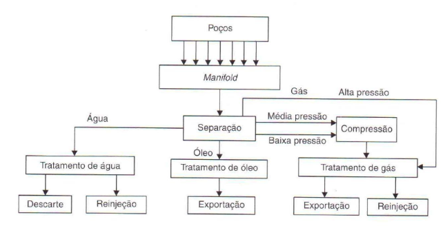 O fluxo de produção chega a um separador (manifold) onde por diferença de densidade, o gás sai pelo topo, o óleo no meio e a água (mais densa) na parte inferior.